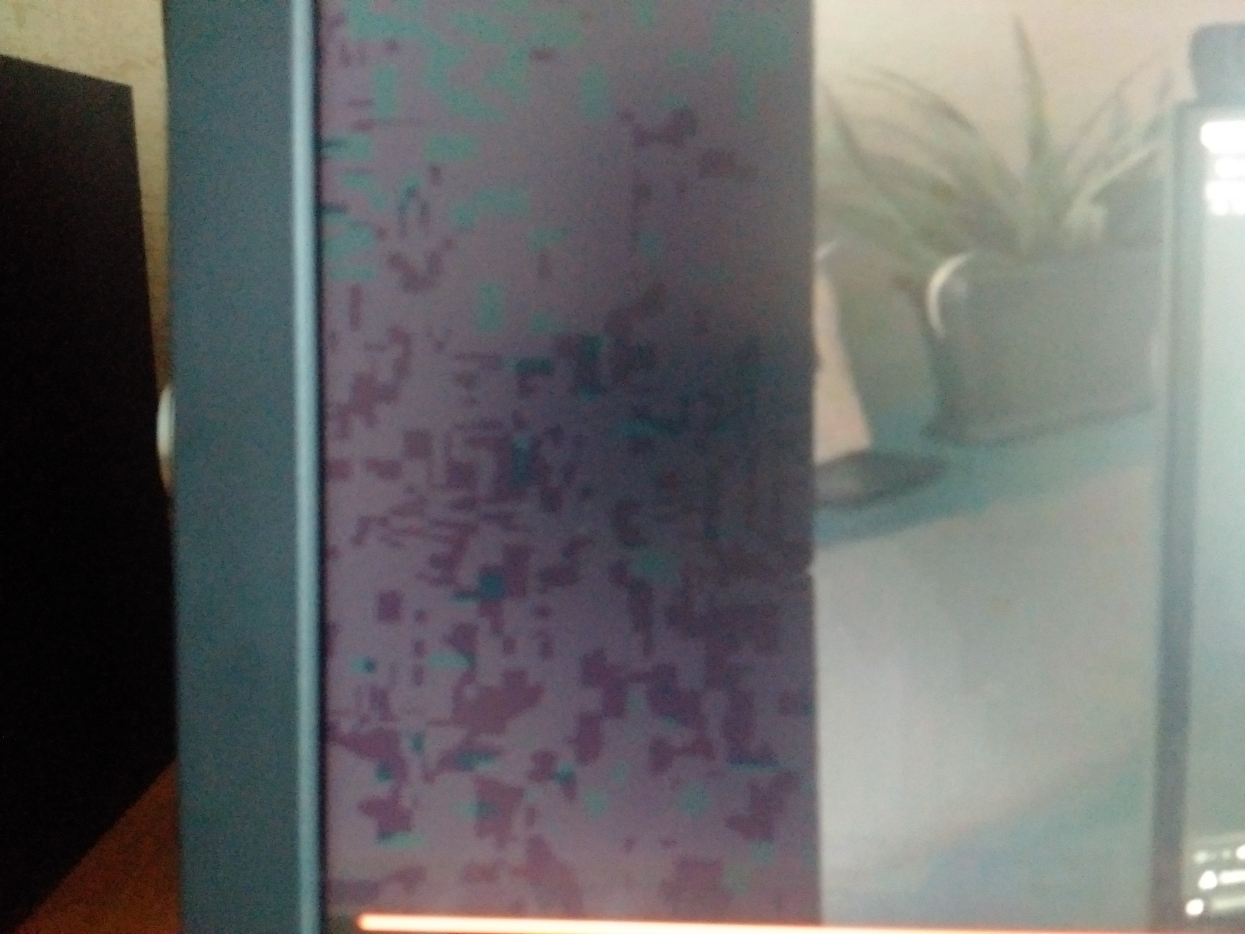 Co do plam (zdjęcie - może to rzucić trochę światła) - i tu tak samo. Z lewej (głównie w rogu) są, z prawej też są, ale nie widoczne na wprost/pod lekkim kątem. Gdy przesunę filmy w inny obszar monitora, przestaja być widoczne.