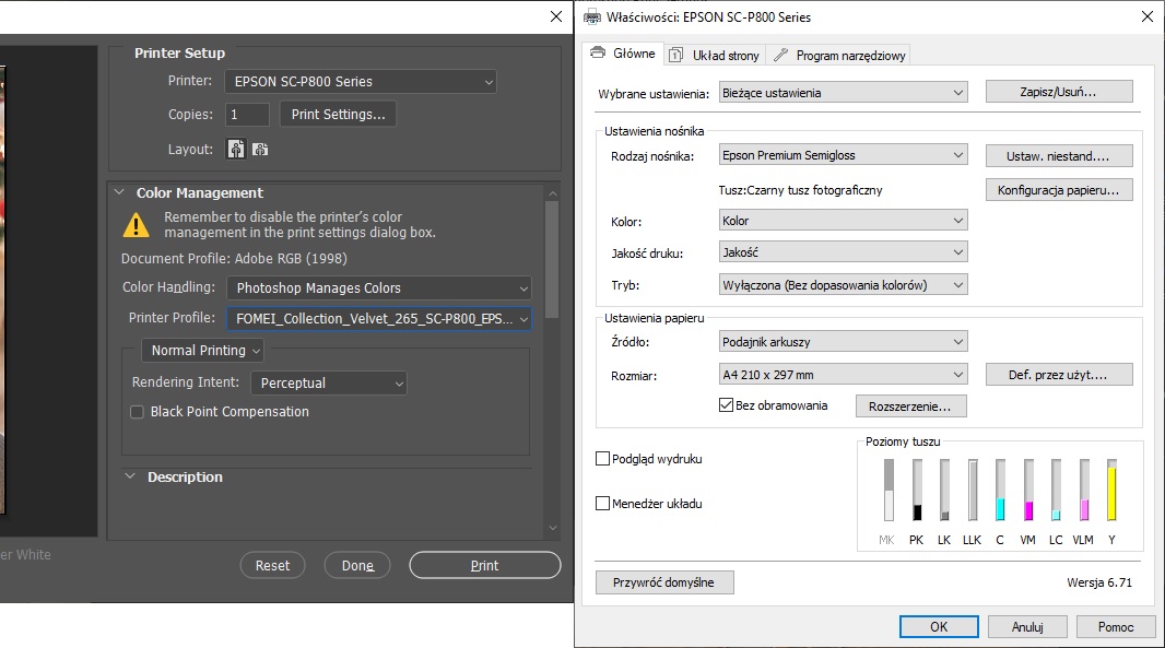 1. Zarządzanie profilem włączam w PS, w sterowniku drukarki mam wyłączone - wydruk fioletowy.