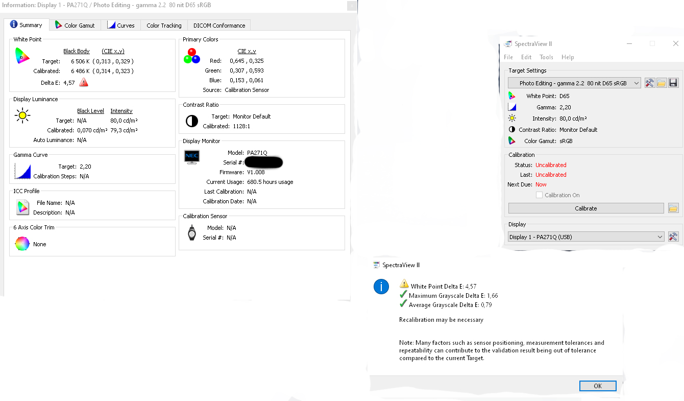 Zwykłej kalibracji nie robiłem, ponieważ jestem na etapie zgłębiania tego tematu i obawiałem się, że mogę pogorszyć sytuację. Używałem tylko opcji Validate Calibration i Colorimeter Window w SVII. I tu dochodzę do moich pytań do forumowiczów znających ten monitor: