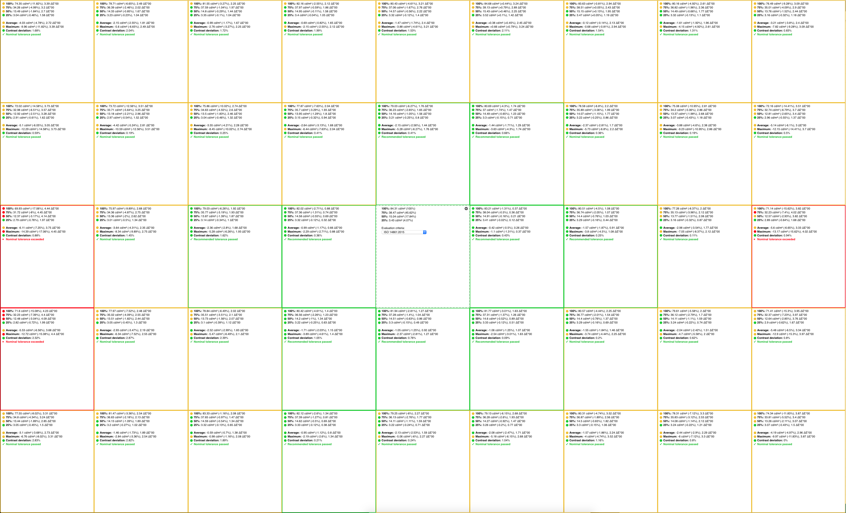 Konkretne wyniki zależą od linii modelowej. Obligatoryjnie odrzucane są monitory z nierównością w jasności przekraczające 10%. Pomiar w siatce 5x4 na monitorach do 24", 5x7 na monitorach 27". Defekty w dziedzinie chrominancji są mierzone jako odchyłka CCT i nie przekracza 5%. Wyższe parametry są osiągalne w monitorach selekcjonowanych i dodatkowo w nich uwzględnia się badanie wycieków przy krawędziach.