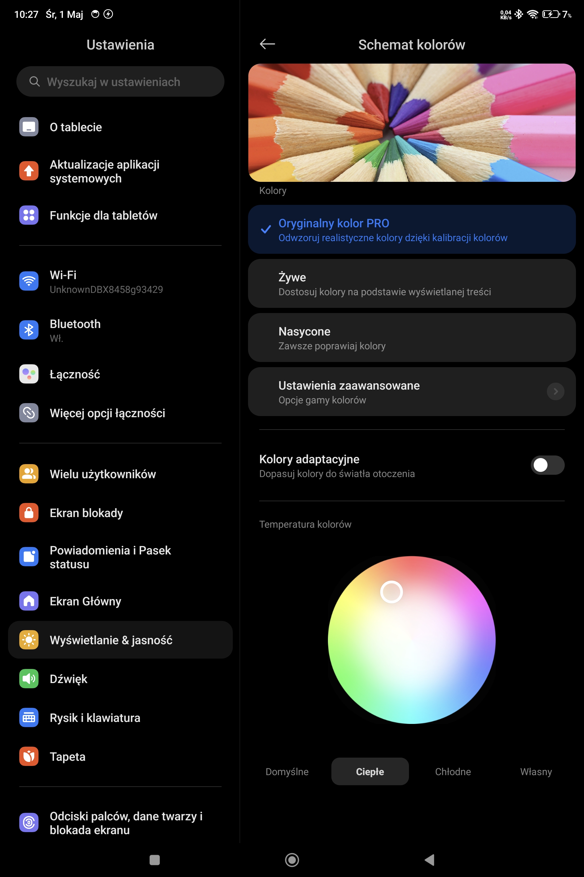 Ustawiłem tablet na tą pierwszą opcję, czyli "Oryginalny kolor PRO" i ciepłą barwę jak na drugim obrazie.