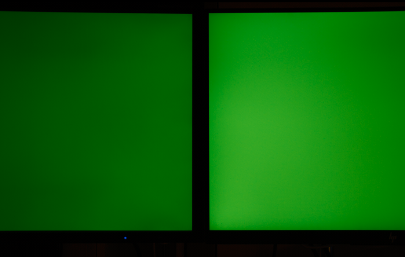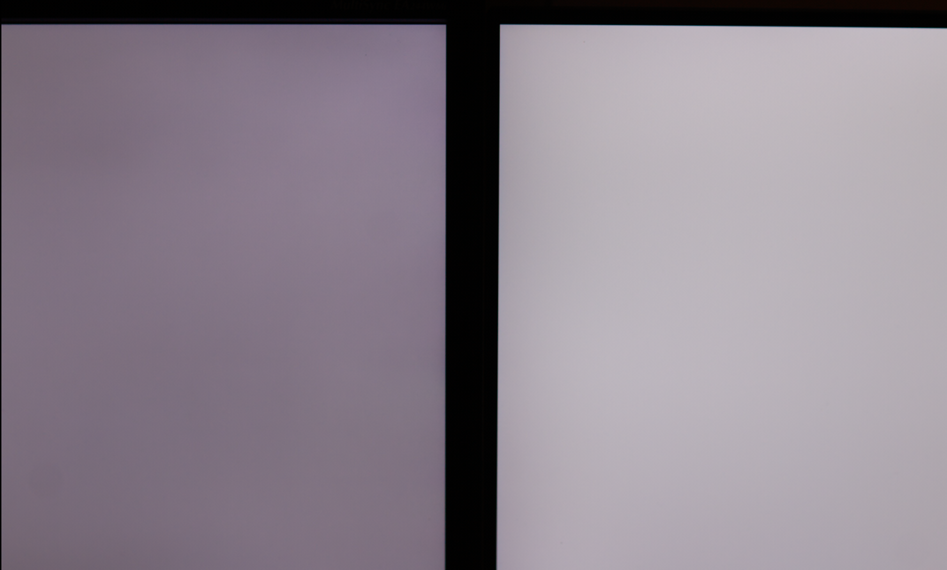 Wrzucam wam jeszcze fotki tych monitorów side-by-side (lewo NEC, prawo HP, oba natywne ustawienia, 100% jasności), nigdy żaden nie był kalibrowany, więc kolory totalnie rozstrzelone między nimi.