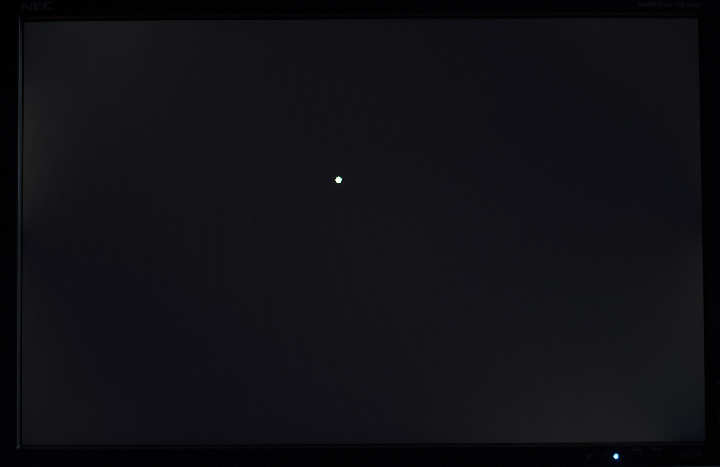 NEC świeci jaśniej niż stary monitor więc starałem się dopasować czas naświetlania zdjęć by na oko było najbliżej do rzeczywistości. Teraz zdjęcia z takimi samymi czasami - NEC prześwietlony oczywiście, ale te 'wycieki' na czarnym są bardziej widoczne. W LG też siedzi stara matryca IPS więc trochę z jej wadami się zapoznałem; niemniej nie ukrywam, że spodziewałem się, że polecany monitor za ponad 3 tysiące złotych zje na śniadanie ten za niecałe 500 zł pod każdym względem. Jak wspomniałem pod względem barw, kontrastów i ogólnie w centralnej części obrazu jest wyraźnie lepiej, ale nie samym centrum oko żyje. Może przesadzam, oczywiście - pierwsze wrażenie po prostu.