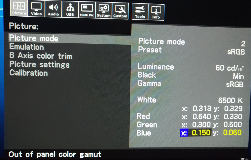 3. W Picture Mode, tryb sRGB (fabryczny) niektóre parametry wyświetlają się na żółto z informacją "Out of panel color gamut" - jak to rozumieć, czy to jest jakiś błąd ?