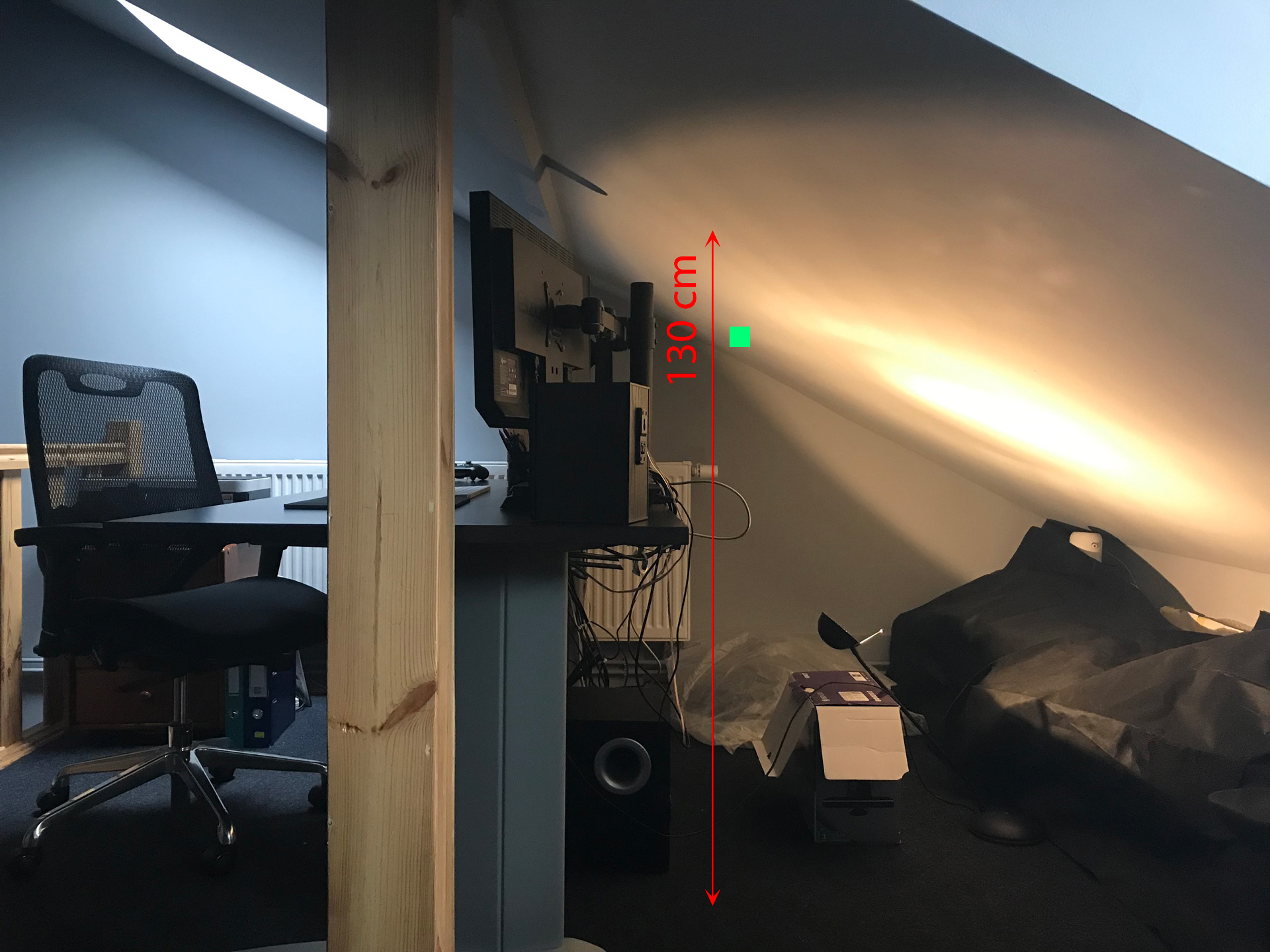 Nad fotelem na wysokości ok 184 cm mam wyjście kabli do oświetlenia. Sam mam 180 cm więc jakbym coś tam zamontował jest duże prawdopodobieństwo że wstając od biurka notorycznie bym walił w to saganem. Odsuwając źródło światła za plecy rzucałbym pewnie cień. Natomiast przysuwając je w stronę monitorów wysokość montażu diametralnie by spadała ze względu na skos i oświetlenie mogło by mi chyba świecić po oczach.