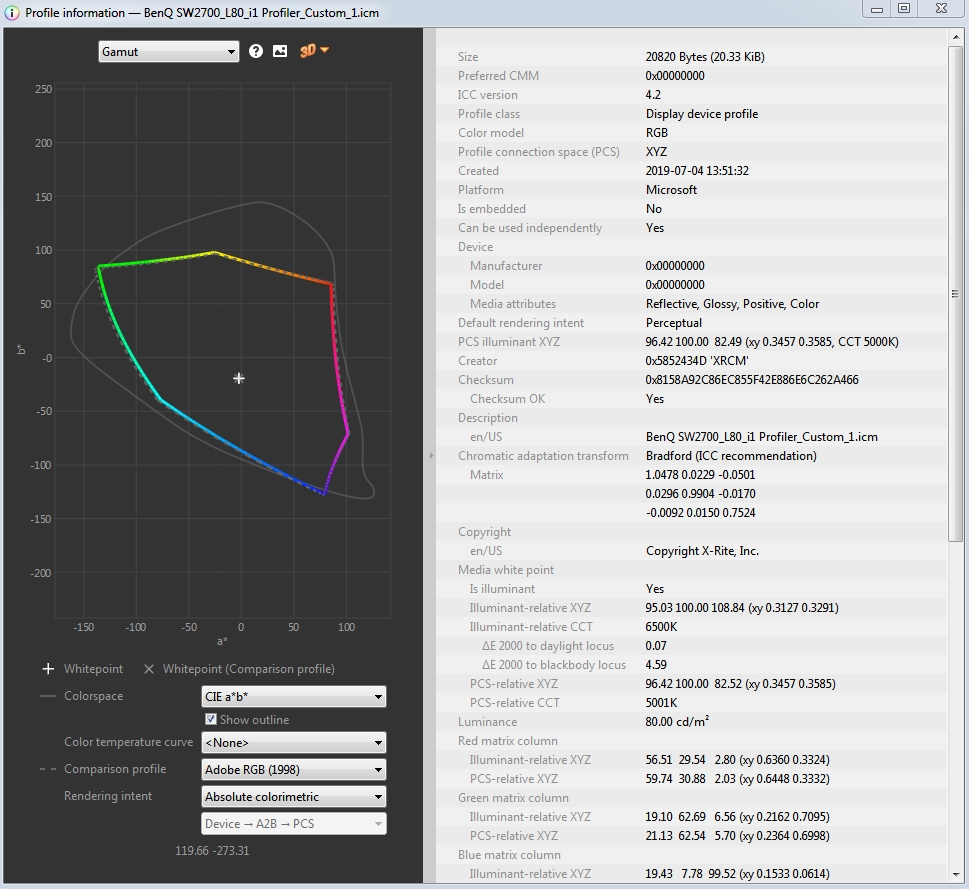 Przeprowadziłem ponowne sprawdzenie kalibracji fabrycznej trybu Adobe RGB w benq SW2700PT. Tym razem poprawnie, jak sądzę :)