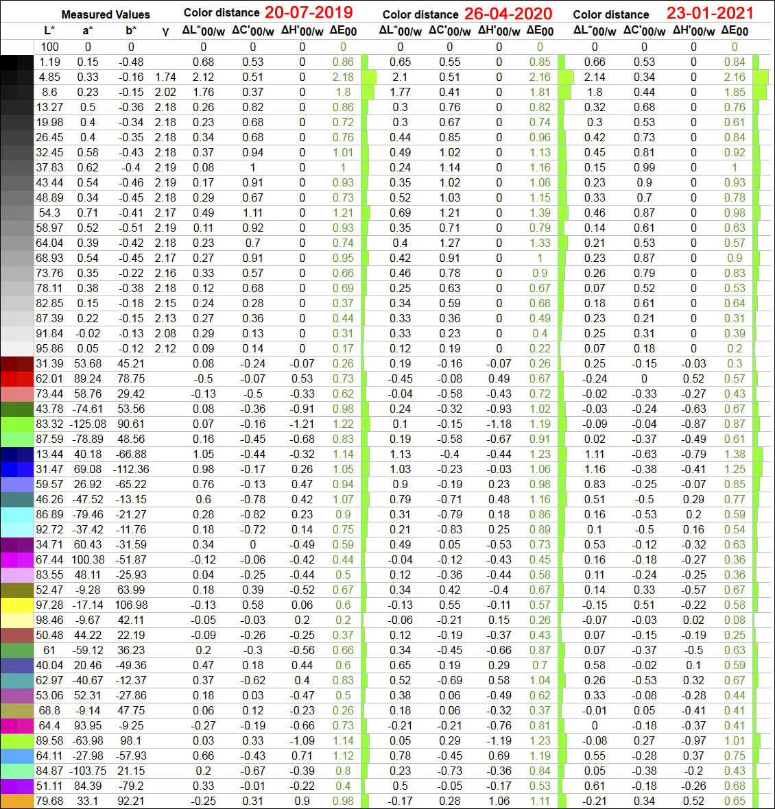 Wstawiam zrzut ekranu z porównaniem tylko błędów Delta E (jak się zmieniały) w odwzorowaniu 51 próbek. Pełne 3 raporty w formacie HTML z DisplayCAL załączone w pliku zip. Weryfikacja wyświetlania przy użyciu oprogramowania ArgyllCMS/DisplayCAL: Ogólnie można stwierdzić malutką tendencję wzrostową, ale na pewno nie taką aby było to możliwe do stwierdzenia wzrokiem. Niektóre próbki maja mniejszy błąd po czasie, wiec pewnie w grę wchodzi także "przypadek", czy błędy własne X Rite i1Display Pro. Weryfikacja wyświetlania przy użyciu oprogramowania ArgyllCMS/DisplayCAL. Sądzę, że następne sprawdzenie zrobię nie prędzej jak za kolejne 9 miesięcy, czyli będzie to po półtora roku od pierwszego pomiaru. Może wówczas będzie można zauważyć jakieś istotne zmiany.