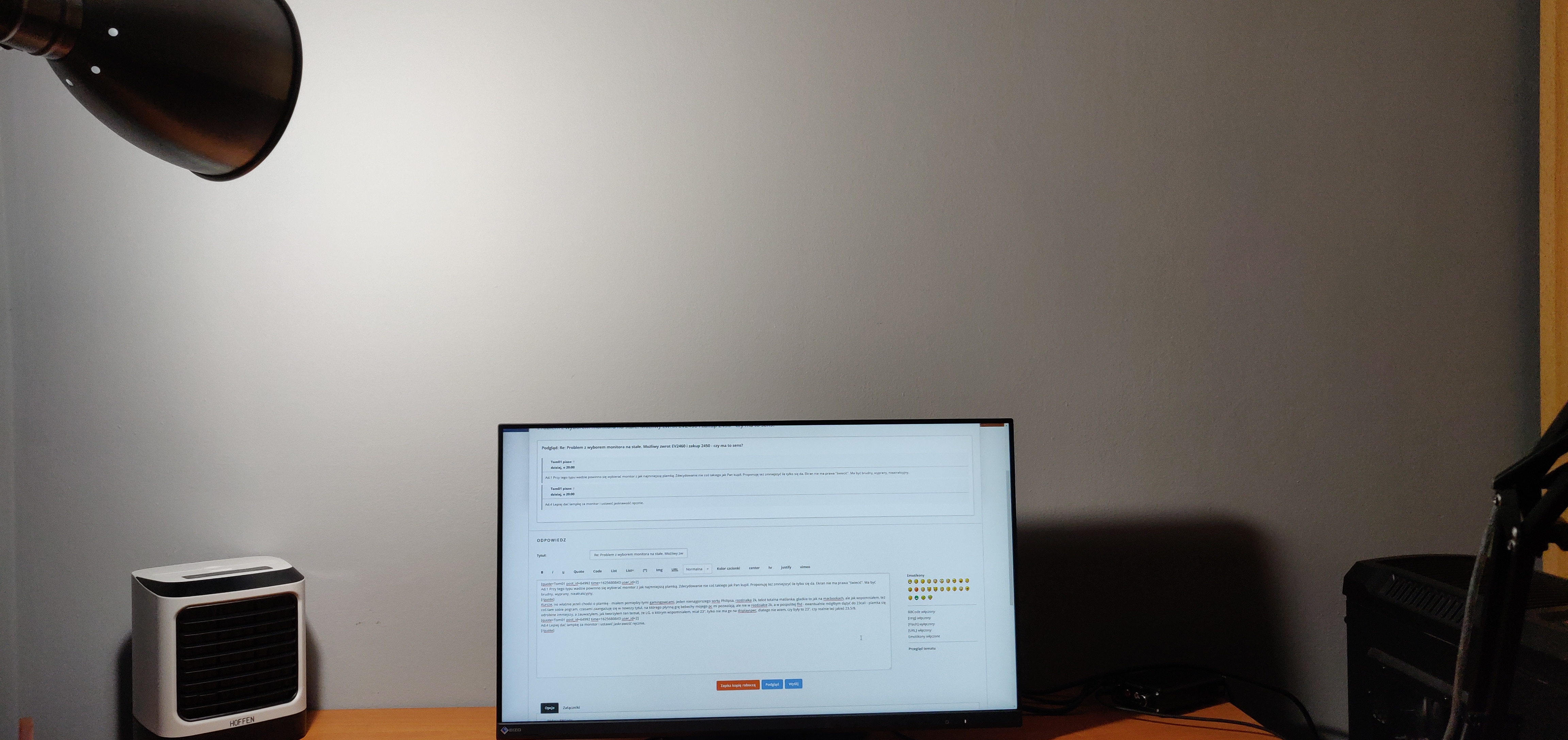 Co do oświetlenia, wygląda ono w ten sposób - na żywo ściana jest trochę lepiej podświetlona (zdjęcie 1). Wpadłem na pewien pomysł, żeby jedną/dwie małe lampki (zdjęcie 2) zamontować na nóżce monitora (zdjęcie 3) i do tego jakieś przyzwoitej jakości żarówki, zalecane 5000/5500k, przy temperaturze monitora 6500k – chyba, że zjeżdżałbym jakoś temperaturą monitora do 5000k i wtedy żarówki z przyjaźniejszym dla wieczorowej pory światłem 2700/3000k.