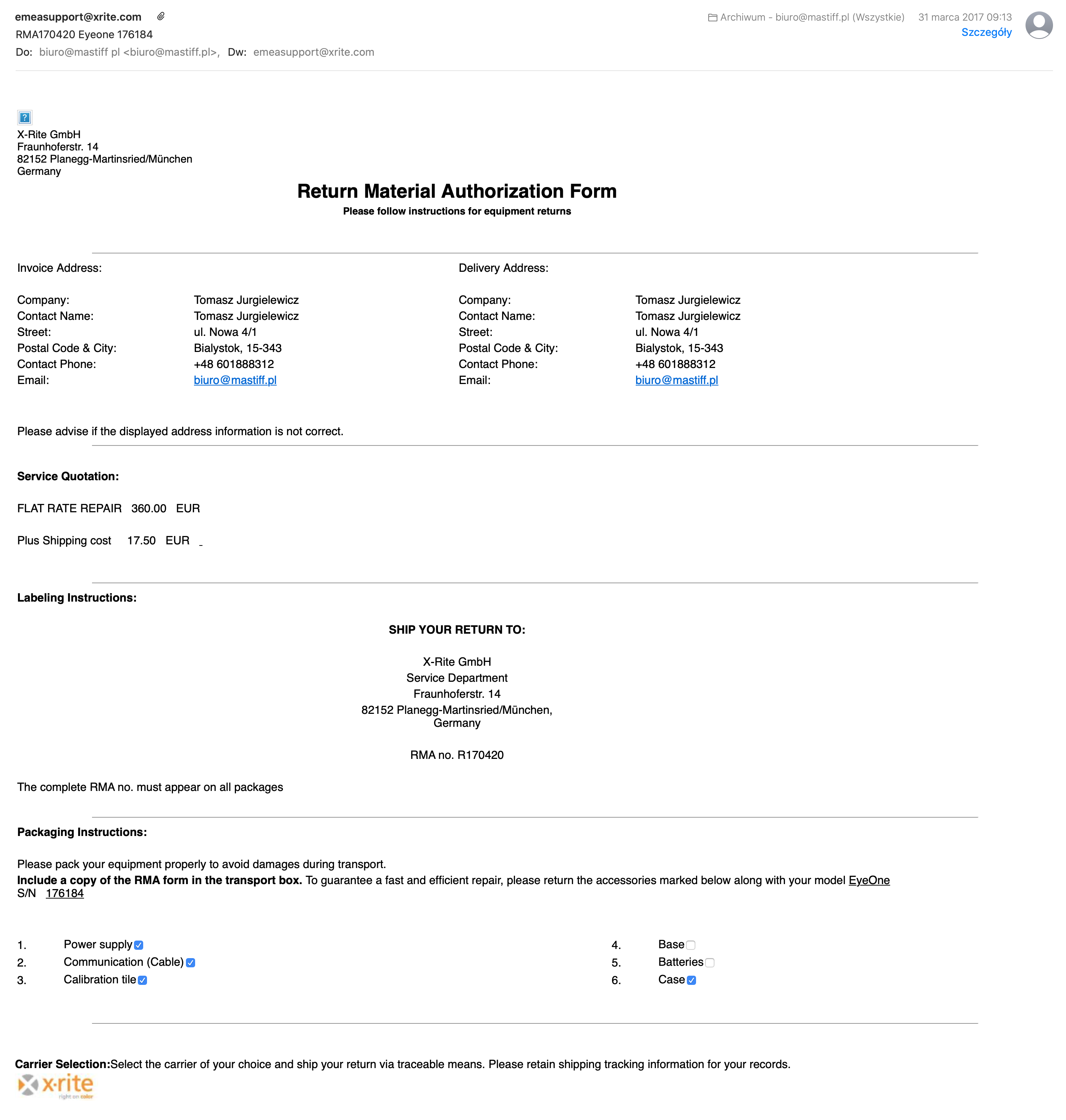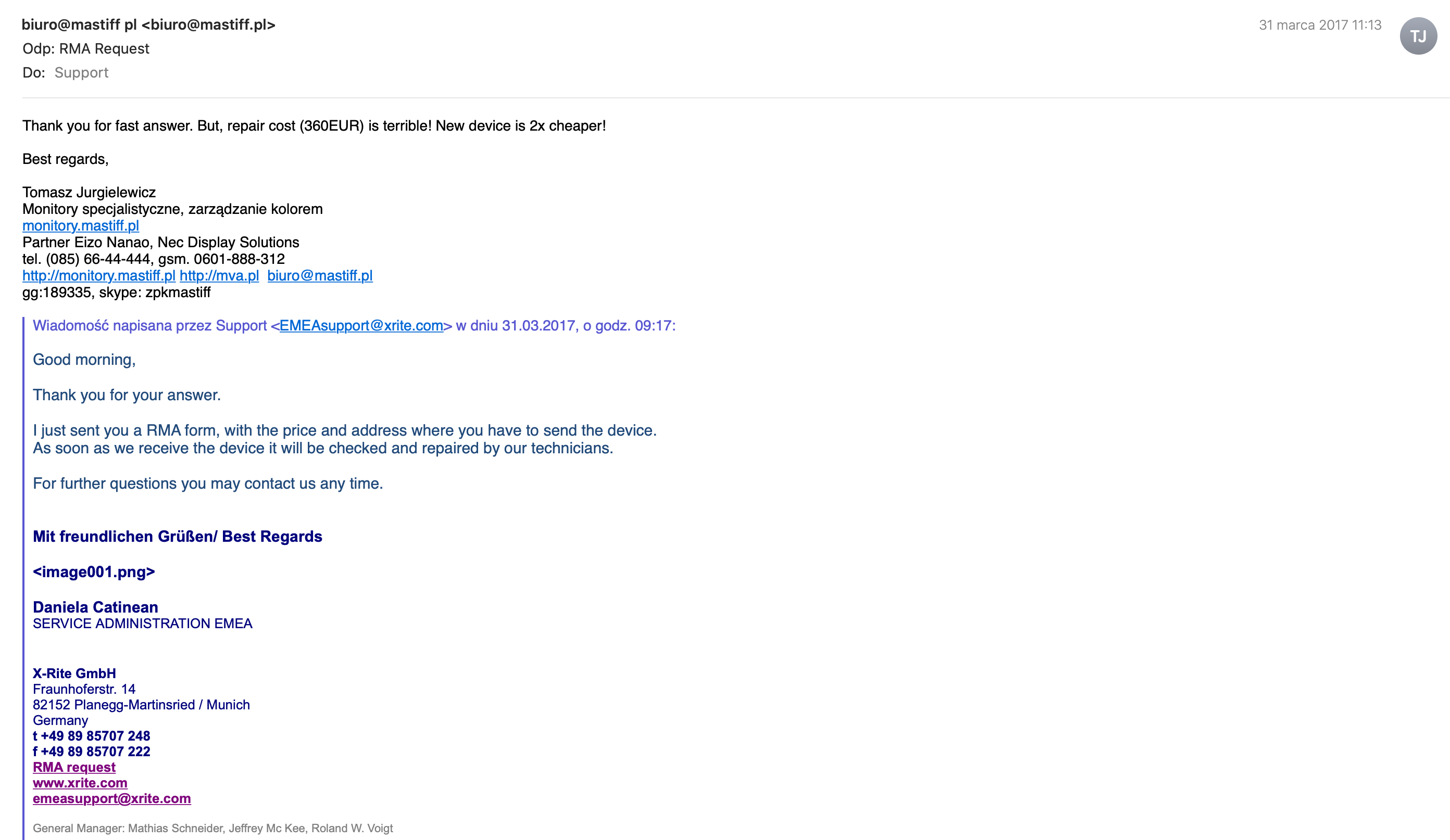 Dla niedowiarków, ostatnia próba wymiany I1D3, który wykazywał duże błędy. Tyle chciał X-Rite za naprawę. Było to zaraz po rozmowie z Panem, Marcin, @Czornyj, i informacji, że X-Rite zapewnia że ble, ble...