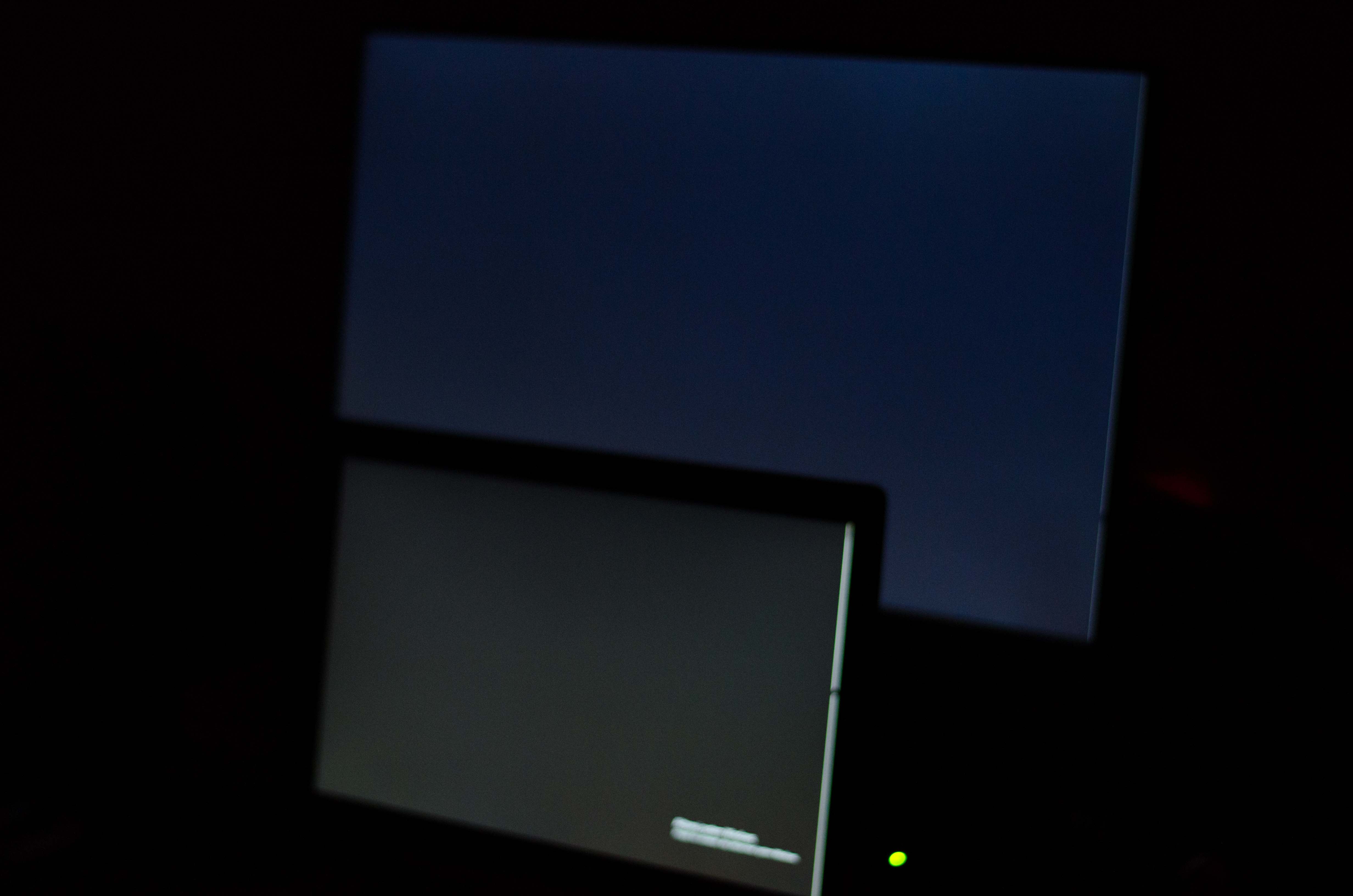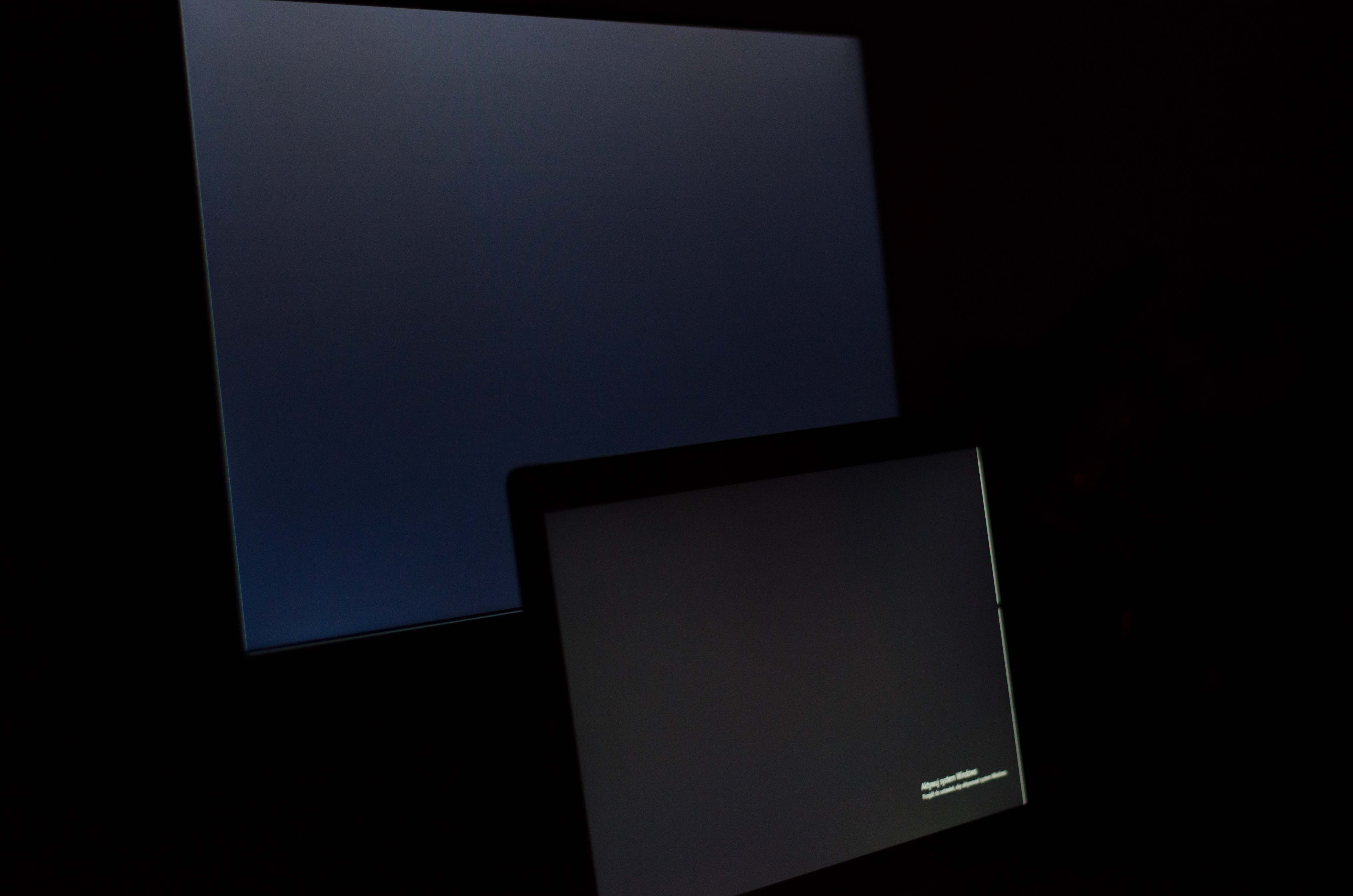 Załączam jeszcze kilka zdjęć porównawczych przy laptopie (matryca IPS, nie jest matowa, model Y700. Zdjęcia wywołane z rawów z podbitą ekspozycją, oba ekrany pokazują czarny kolor):