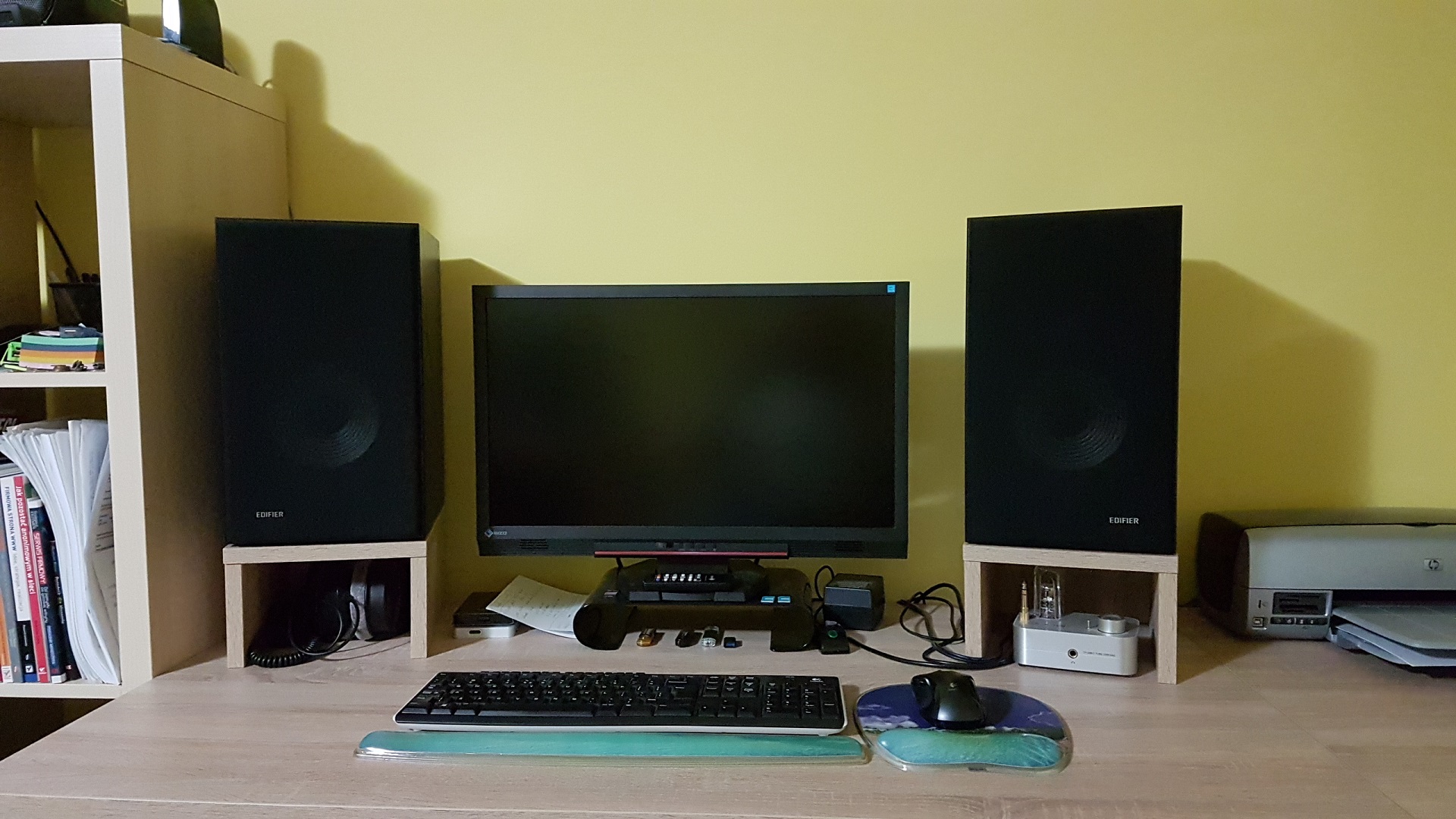 Ściana jest żółta, a sufit biały, więc będzie walić żółcią. Ale trochę na ścianę też trzeba, aby zrównać ją jasnością z monitorem.