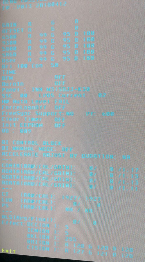 BI CONTROL to blok od czujnika światła pod ramką monitora bo kiedy świecę tam diodą w telefonie to cała sekcja CDATA RDATA GDATA BDATA CT LUX tańczy zmieniając różne wartości - czyli jakiś odczyt i korekty na bieżąco. Jak włączę BI MANUAL MODE na ON to wartości w niektórych sekcjach zmieniają się na stałe i można je regulować. Czyli ten block to automatyczna regulacja w zależności od otoczenia.