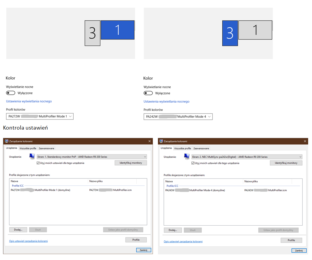 Otóż mam dwa monitory, oba szerokogamutowe z możliwością dowolnej symulacji koloru. System Windows 10 z najnowszą aktualizacją. Ustawione są następująco: