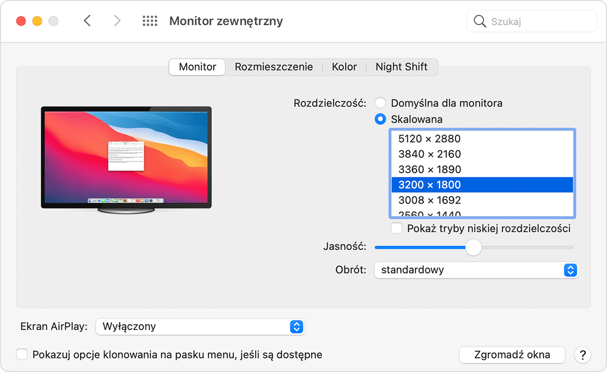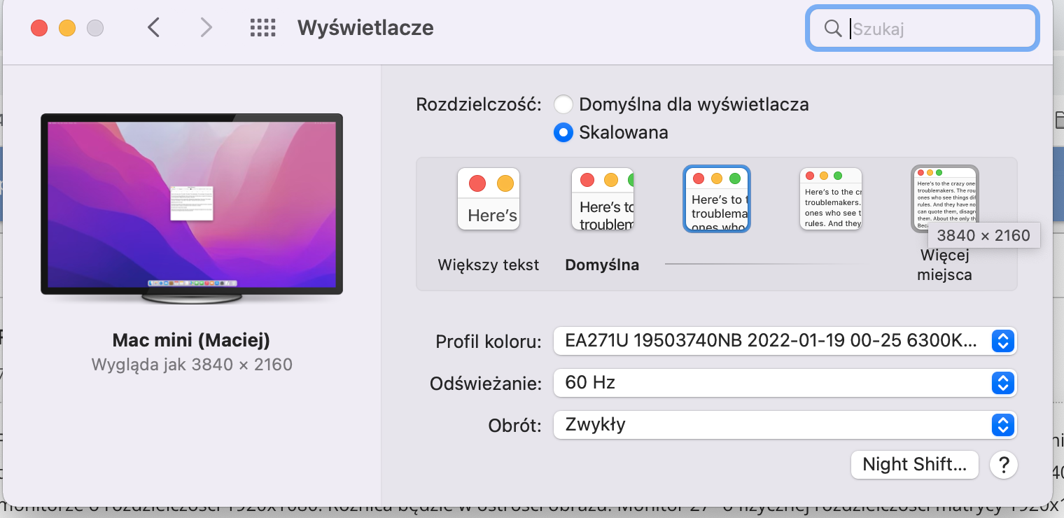 Jeśli przy ustawieniu rozdzielczości 3840x2160 tekst jest nieczytelny w preferencjach systemowych > monitory, ustaw rozdzielczość skalowaną np. na 2560x1440.