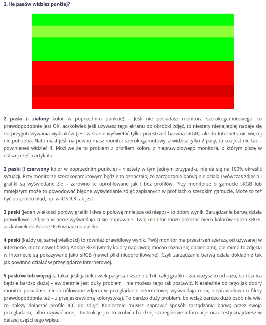 U mnie podobnie się wyświetla (czyli źle) ten testowy obrazek w przeglądarce Firefox : Natomiast w przeglądarce Google Chrome (ten sam obrazek testowy) wyświetla się u mnie tak: Mam szerokogamutowy monitor i wyraźnie widzę 4 paski o różnych kolorach (miałem tak wcześniej również w Firefox)