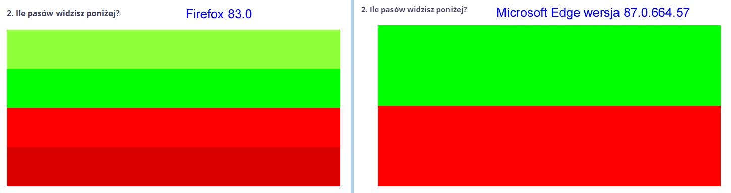 W tym momencie siedzę na bieda-gamutowcu (marne ~102% wielkości wzgl. sRGB) i wyglądają te paski tak samo na Firefox 83 jak i Edge 87.0.664.57 . Tzn. widzę 4 paski (ledwie, ledwie 4, a nie dwa, pewnie z tego powodu, że tylko odrobinę różni się gamut monitora od sRGB).