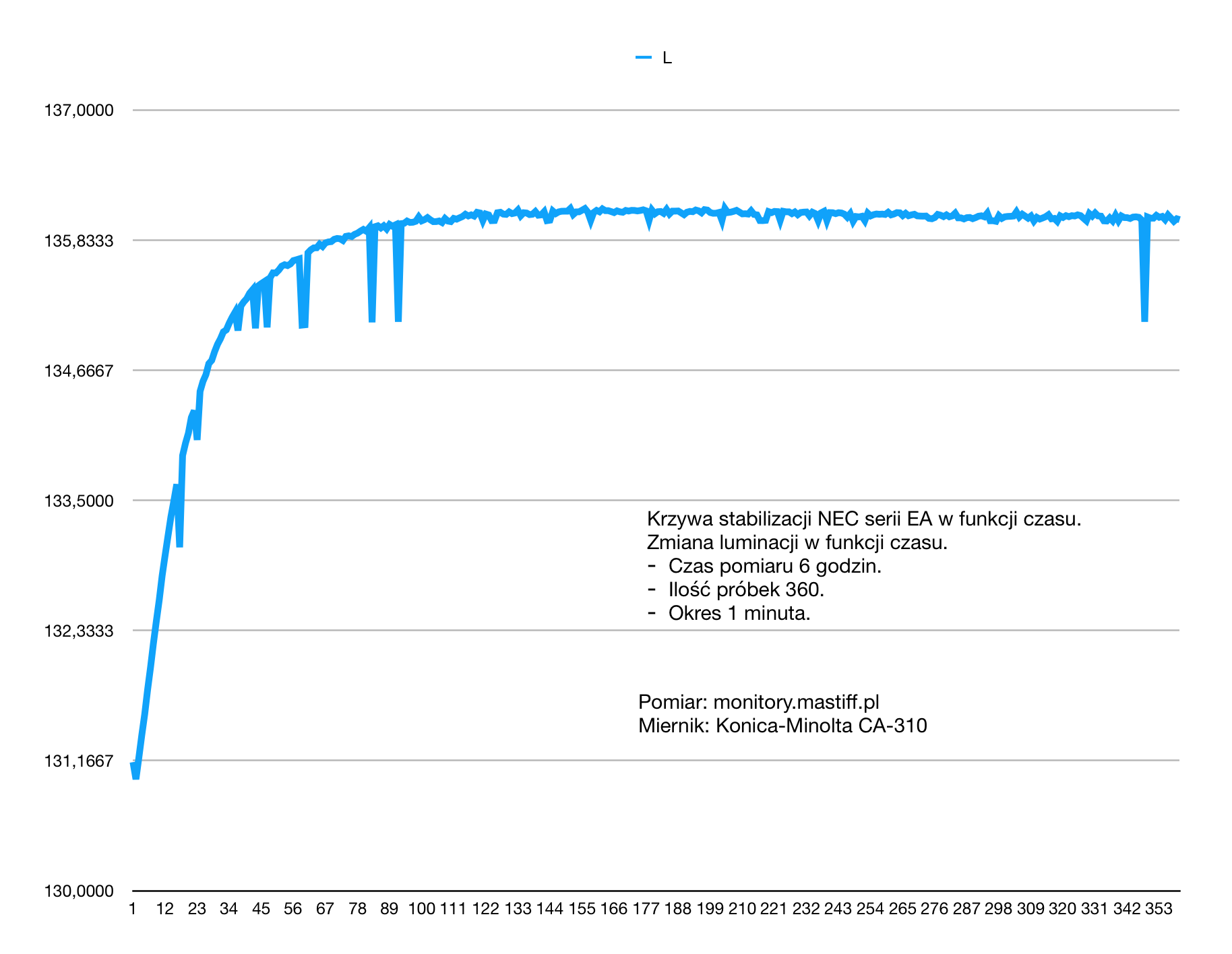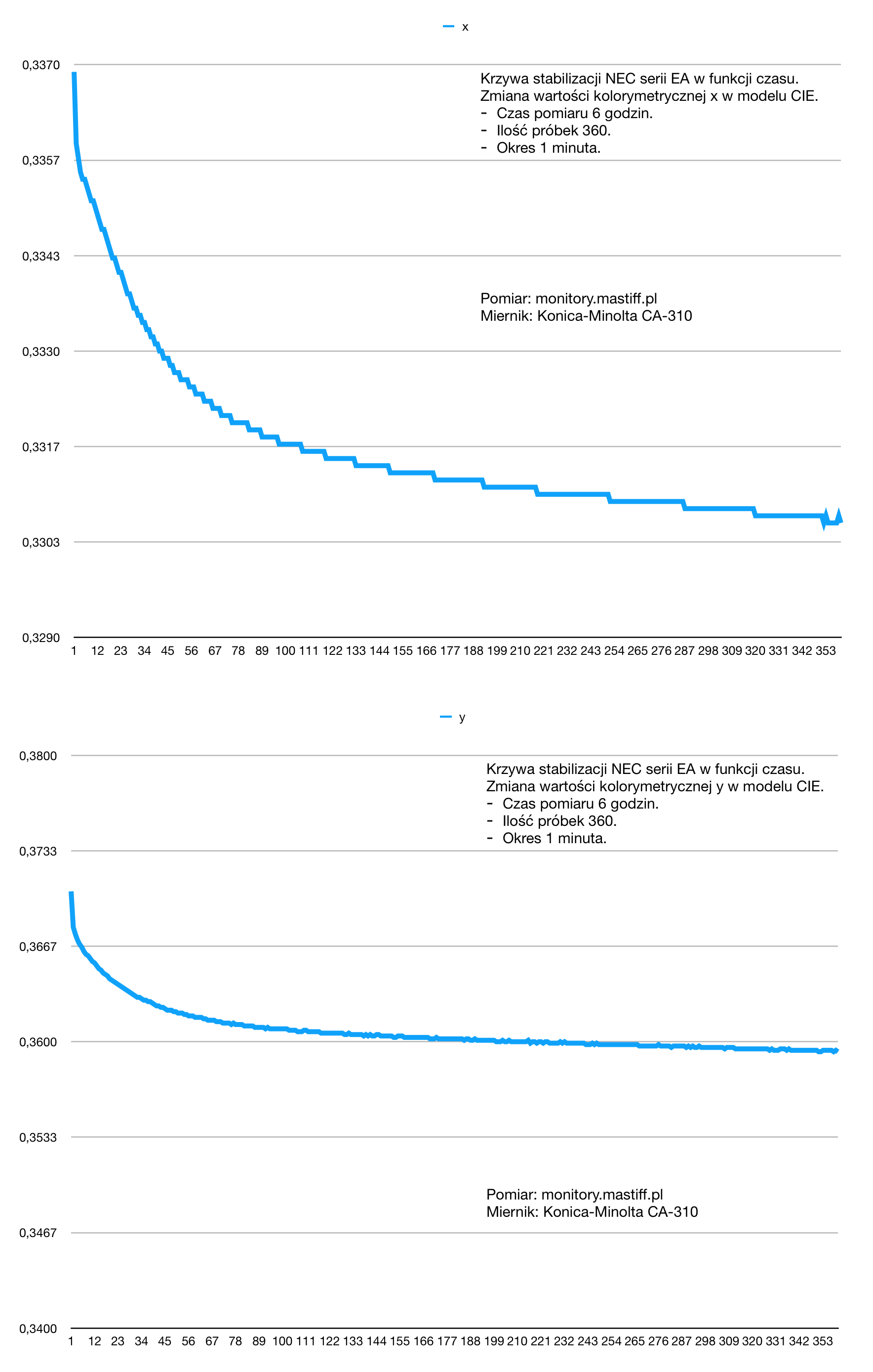 Punkt bieli wielokrotnie dłużej. Jak widać, po 6h punkt bieli nadal płynie. Zalecana stabilizacja to MINIMUM kilka godzin. Ja je stabilizuję 10 do 25h. Selekcjonowane dużo dłużej. Dopiero wówczas można kalibrować przy parametrach jakie ten monitor ma rzeczywiście.