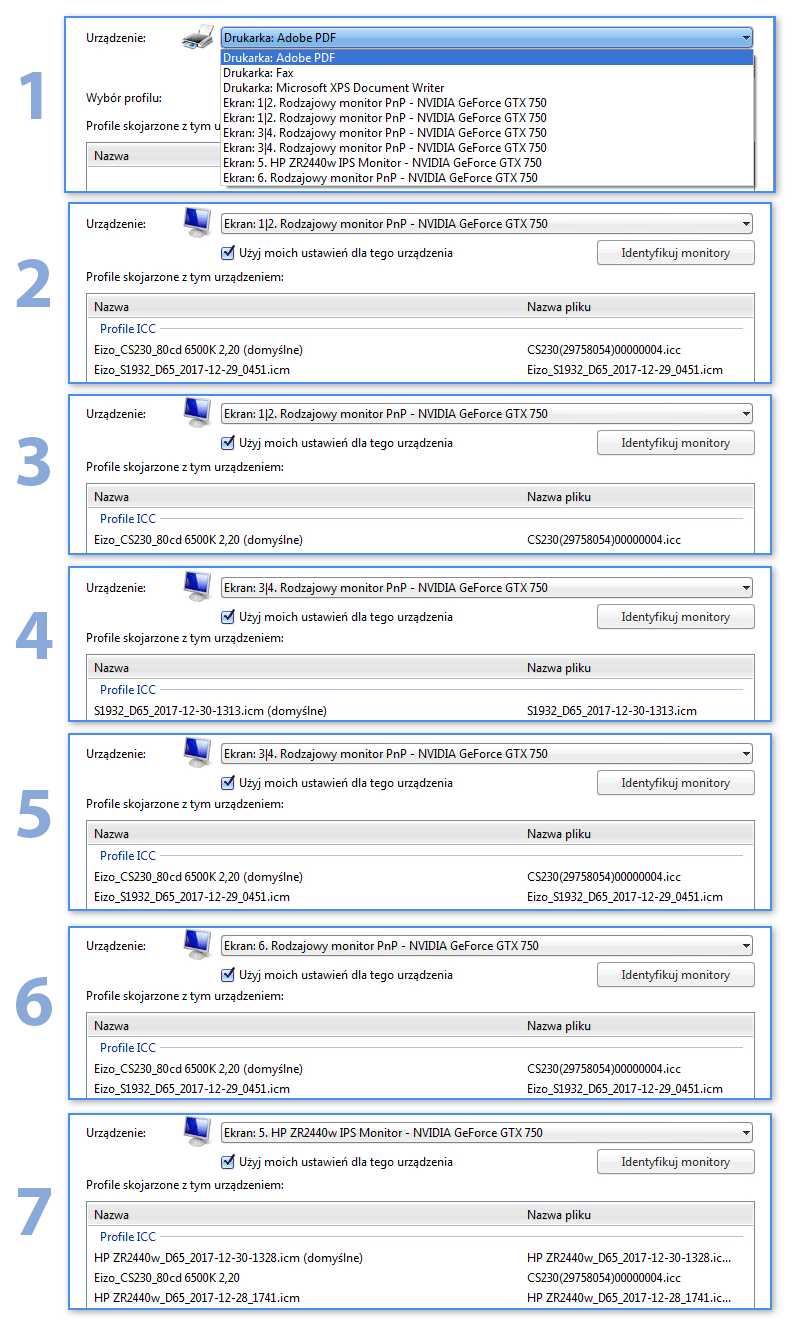 2. Jak widać po screenach mam jakieś dziwne oznaczenia ekranów: "1|2" oraz "3|4"; zamiast po prostu: "1", "2", "3" itd. Widać tu również, że profil Eizo CS230 przejął większość władzy, czego właśnie również nie kumam.