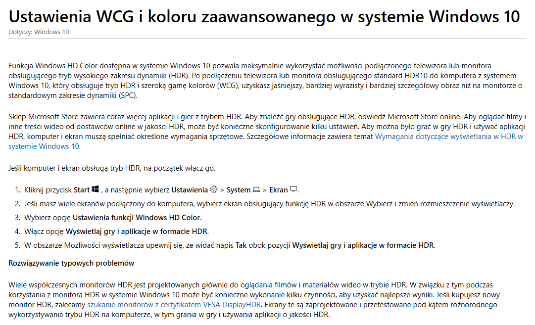A zatem. Najnowszy Windows 10 widzi każdy standardowy monitor, w tym dowolny szerokogamutowy monitor profesjonalny WCG, jako monitor SDR.