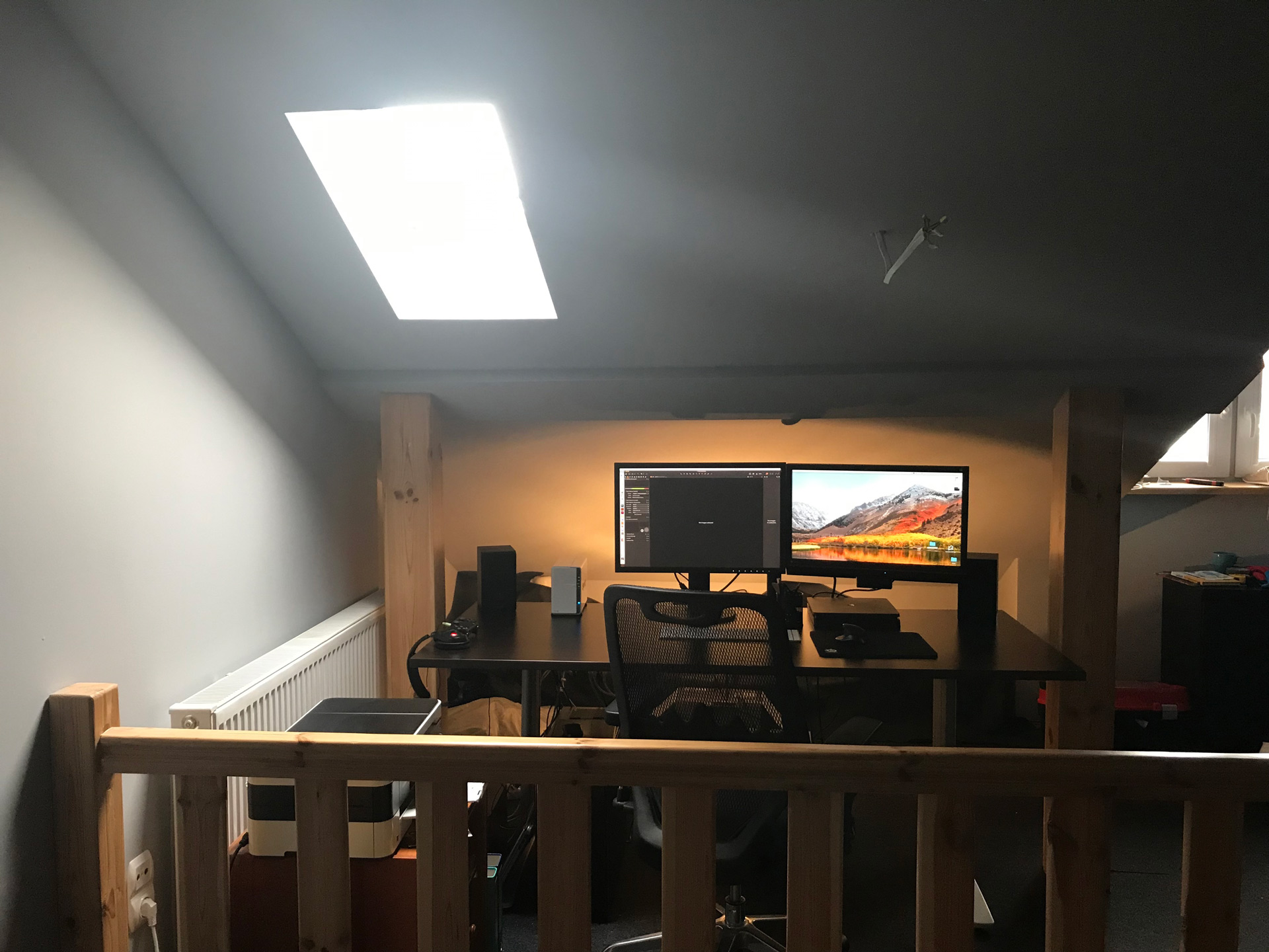 Jestem na etapie tworzenia dla siebie pracowni do retuszu zdjęć. Znajduje się ona na poddaszu. Ściany pomalowałem na neutralny szary a w okna wstawiłem szare rolety z gumą więc można całkowicie odciąć dopływ naturalnego światła. Potrzebuję "tylko" zrobić oświetlenie za monitorem na tło i dodatkowe światło nad stanowiskiem do porównywania wydrukowanych zdjęć ale pojawiają się dwa dwa problemy
