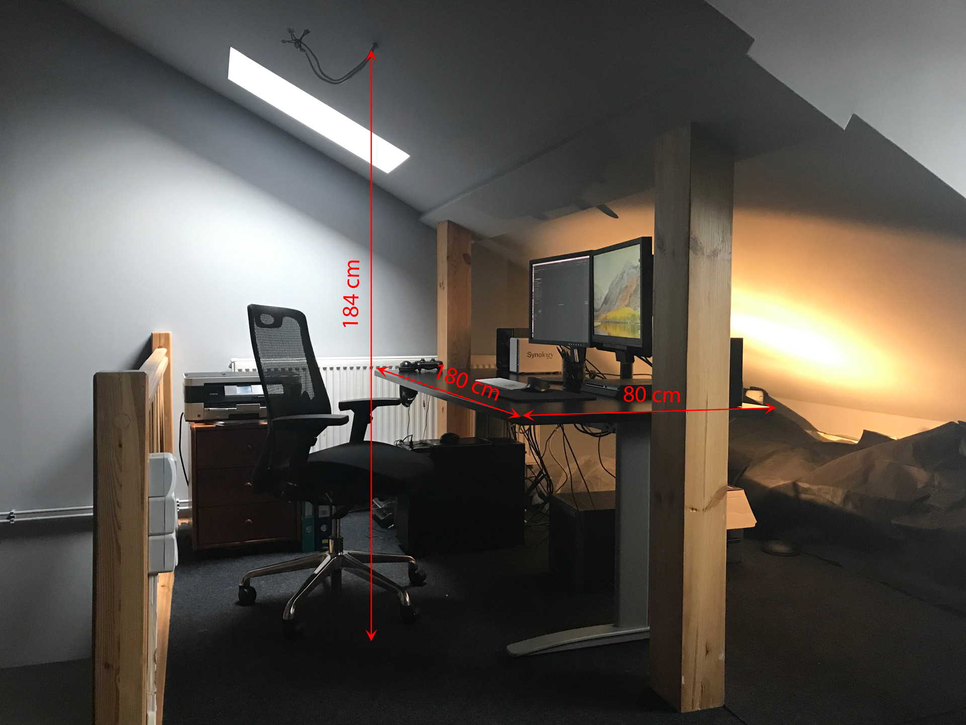 Nad fotelem na wysokości ok 184 cm mam wyjście kabli do oświetlenia. Sam mam 180 cm więc jakbym coś tam zamontował jest duże prawdopodobieństwo że wstając od biurka notorycznie bym walił w to saganem. Odsuwając źródło światła za plecy rzucałbym pewnie cień. Natomiast przysuwając je w stronę monitorów wysokość montażu diametralnie by spadała ze względu na skos i oświetlenie mogło by mi chyba świecić po oczach.