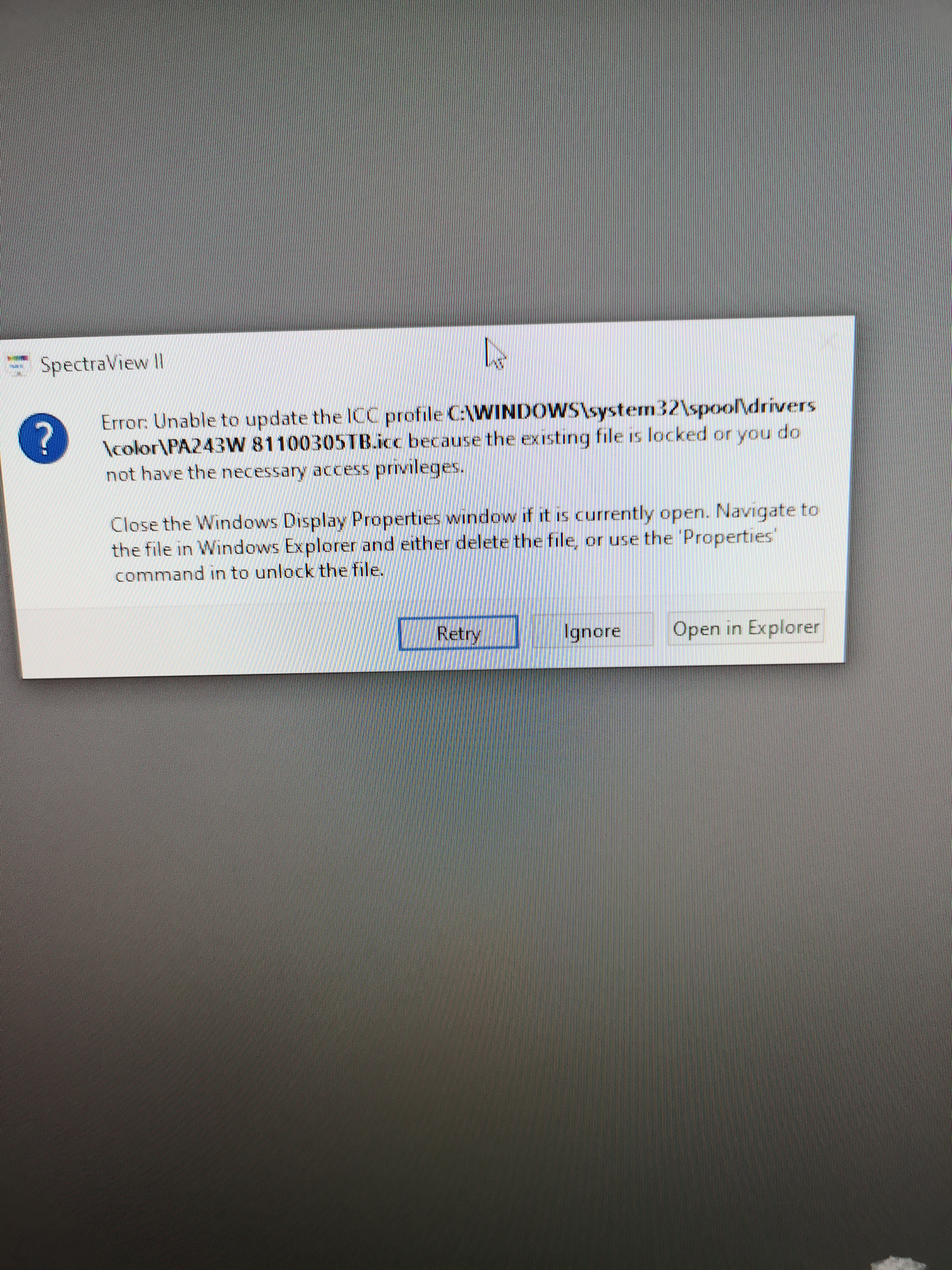 Może nowsza wersja Spectraview rozwiąże ten problem. Oprogramowanie standardowe do i1 DisplayPro nie robiło mi takich problemów na 1903.