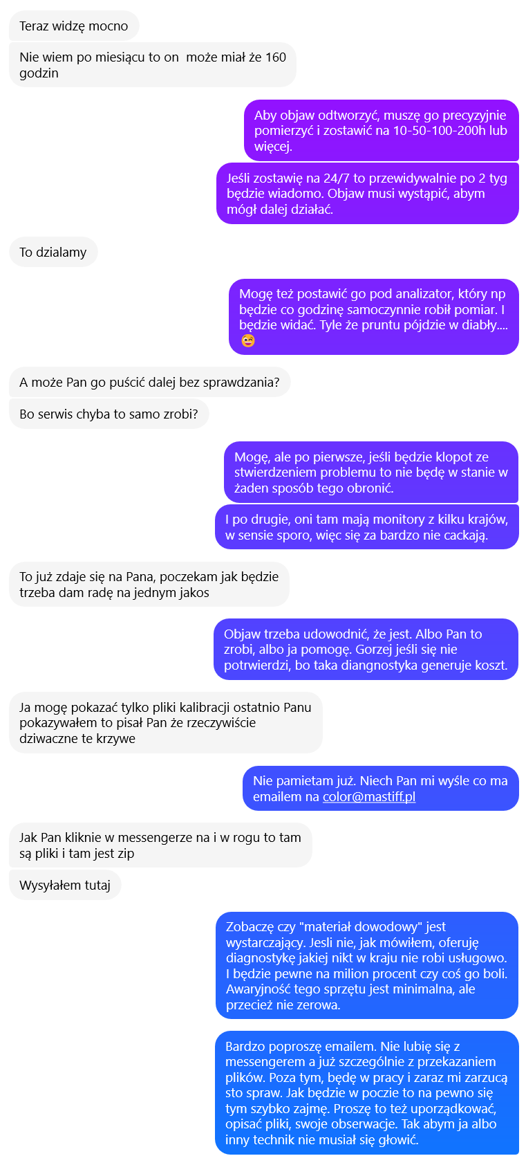 "Wsparcie pozakupowe otrzymał Pan bardzo szerokie. Konsultacje niezależnie od dnia i godziny. Bezpłatne wypożyczenia czujników. Teraz szczegółowa diagnostyka. Nie zapominajmy też, że miał Pan cenę zakupu też rabatowaną. Odnoszę wrażenie, że zaczyna Pan mnie wykorzystywać. Tak, dodatkowa kalibracja to dla mnie kolejne obciążenie czasem, którego nie mam. Jeśli natomiast mówimy o kompletnej procedurze COLOR, robi to automat, ja nie jestem zaangażowany.