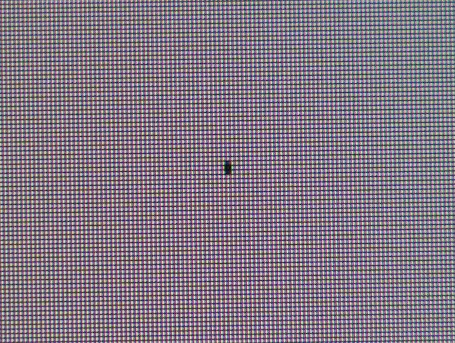 Tu zajęte są trzy pełne piksele, a trzy martwe obok siebie to by była niespodziewajka.. Obstawiam raczej paproch lub inne ciało obce. Spróbuj też ewentualnie dogadać się jednak ze sprzedawcą - poza gwarancją masz jeszcze rękojmię, ale trzeba zweryfikować aktualne przepisy.