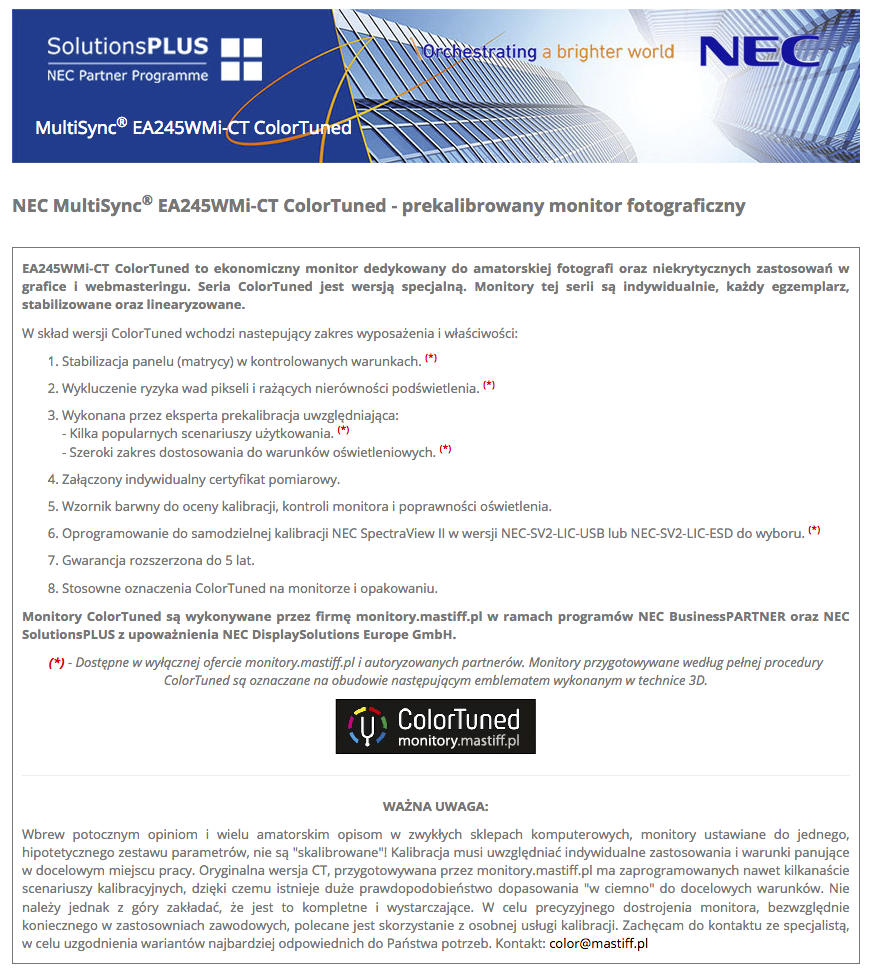 Warte wzmianki jest, że CT ma 5 lat gwarancji nie 3, ma eliminowane dyskwalifikujące wady nierówności podświetlenia, piksele. Taki monitor kompleksowo przygotowany tak samo jak serie profesjonalne, jest na dodatek tańszy (z wyjątkiem EA275UHD-CT), niż wersja seryjna + dokupienie elementów różniących.