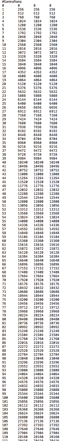 Ilość danych jest większa oczywiście w pierwszym przypadku. Nie ma jednak żadnych obliczeń, to jest robione w czasie kalibracji. Target jest gotowymi kolumnami liczb. Ładowanie to tylko kopiowanie. W EIZO tablice liczy się za każdym razem, ale robi to procesor komputera, dużo mocniejszy, więc trwa to krótko. Poniżej kawałek gotowej rzeczywistej tablicy: