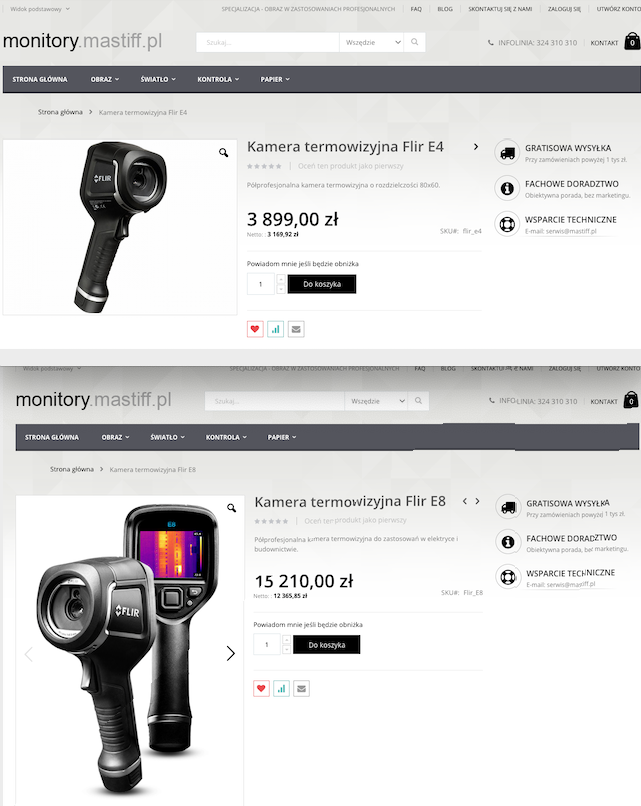 Aby lepiej zobrazować jak wielki wpływ ma konfiguracja oprogramowania wewnętrznego na osiągi urządzenia, pociągnę dalej przykład kamer termowizyjnych. Jak pisałem, kamery Flir serii E to dokładnie te same urządzenia. te same procesory, matryce, ekrany itd. Cytując Pana, różnią się tylko naklejką. Kosztują jednak różnie: