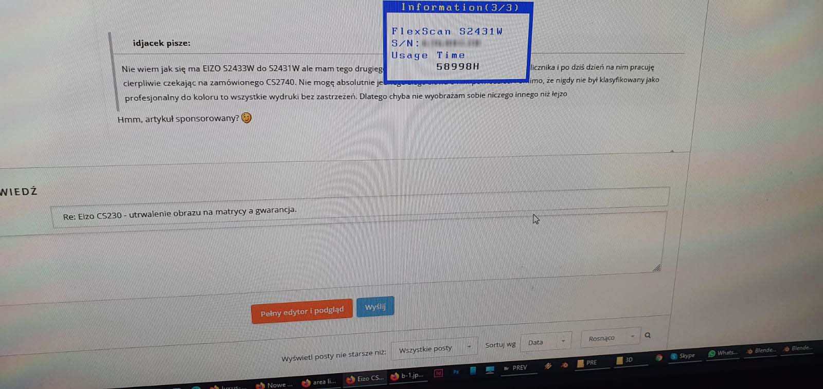 Nie wiem jak się ma EIZO S2433W do S2431W ale mam tego drugiego kupionego w 2005 roku, 59K h pracy wg licznika i po dziś dzień na nim pracuję cierpliwie czekając na zamówionego CS2740. Nie mogę absolutnie jednego złego słowa o nim powiedzieć. Pomimo, że nigdy nie był klasyfikowany jako profesjonalny do koloru to wszystkie wydruki bez zastrzeżeń. Dlatego chyba nie wyobrażam sobie niczego innego niż łejzo