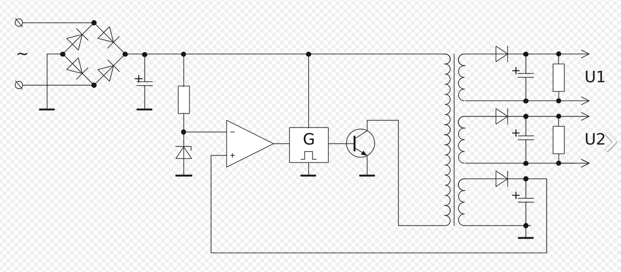 Ostatnia próba przemówienia Panu do wyobraźni. Poniżej schemat jednego z najprostszych zasilaczy impulsowych. Gdzie Pan tu widzi możliwość powstawania napięcia stałego? Ma Pan generator i impuls napięciowy wytworzony przez tranzystor kluczujący. Ten impuls przenosi się na stronę wtórną transformatora. Na wyjściu ma lepiej lub gorzej wygładzone napięcie o przebiegu impulsowym. Tętniącym tylko dzięki kondensatorom.