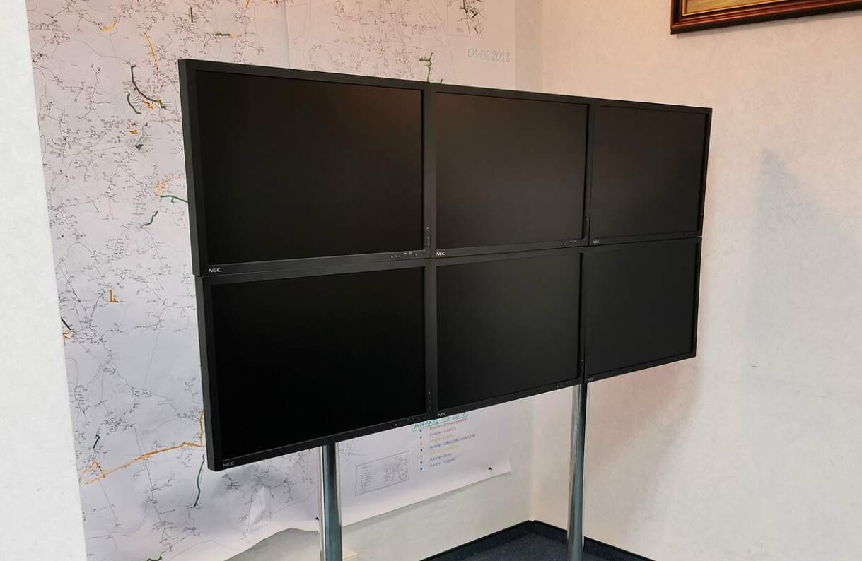 Jeśli układ ma być typu monitor nad monitorem, wówczas całe stanowisko musi być dość daleko, wg mojej oceny ponad metr od użytkownika i niższe monitory wówczas praktycznie na wysokosci blatu. Inaczej górne wychodzą strasznie wysoko. Robiłem niedawno takie instalacje jak na zdjęciu poniżej i miałem okazję przetestować użyteczność.