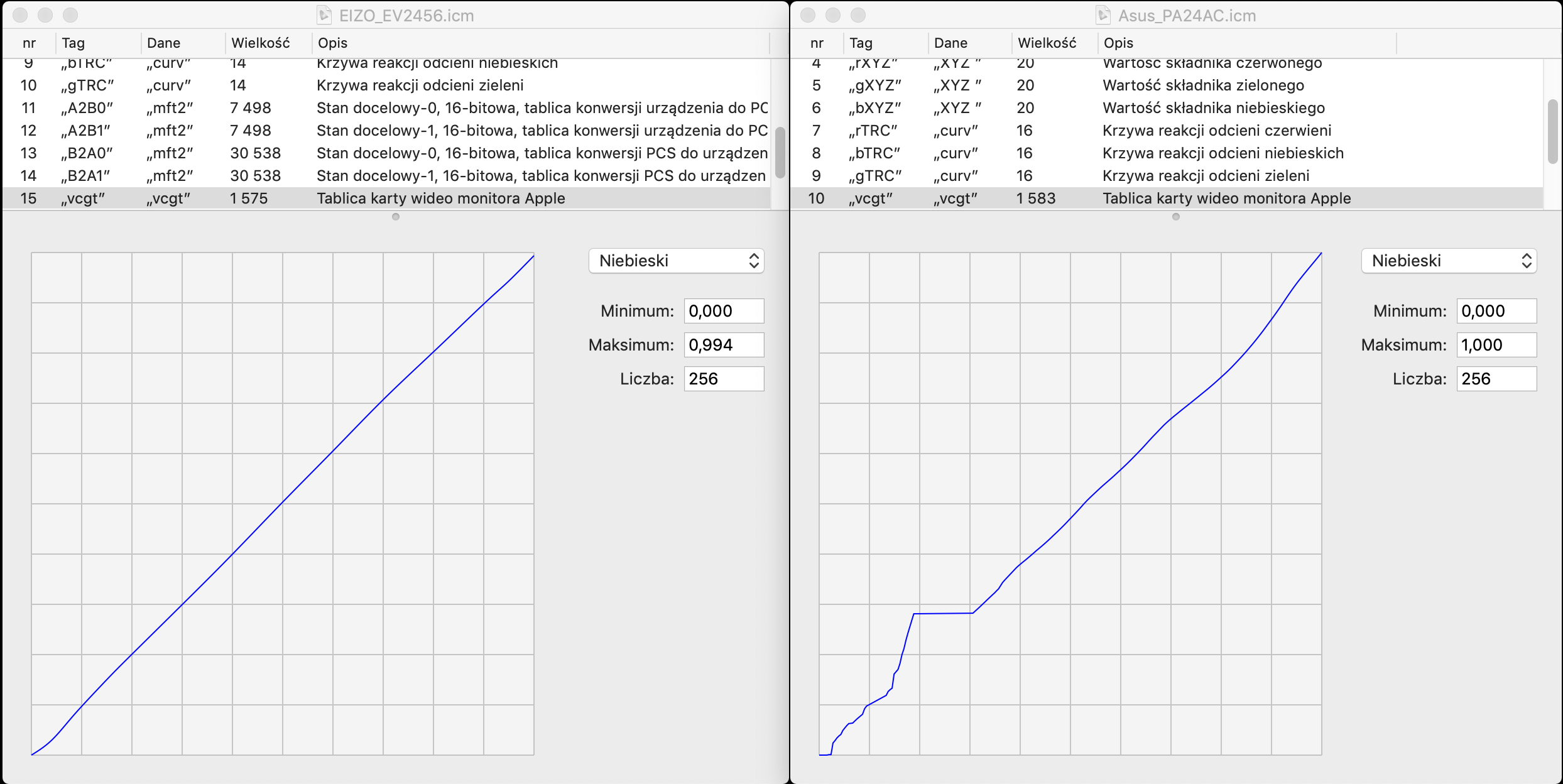 Porównanie liniowości monitorów w kanale B, z bardzo podobnej grupy cenowej. Po lewej biurowo-korporacyjny EIZO EV2456, który nie ma kalibracji, stabilizacji. Prosty monitor uniwersalny z 10 bitowym LUT programowanym w fabryce. Po prawej nowy model Asus PA24AC, który wg zapewnień producenta ma kalibrację opartą o 14 bitowy LUT.
