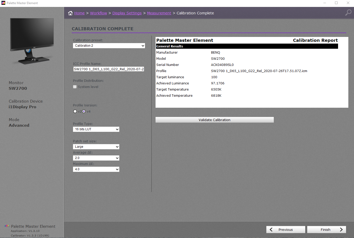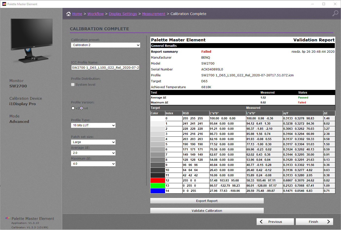 Cały proces dokonywany jest w aplikacji Palette Element Master. Ustawienia naprawdę różne już próbowałem (tryb zaawansowany i eskperymenty: Long Path Size, relative black point, Lut16b itp). Za każdym razem wyniki były bardzo przeciętne (wręcz laptopowe).