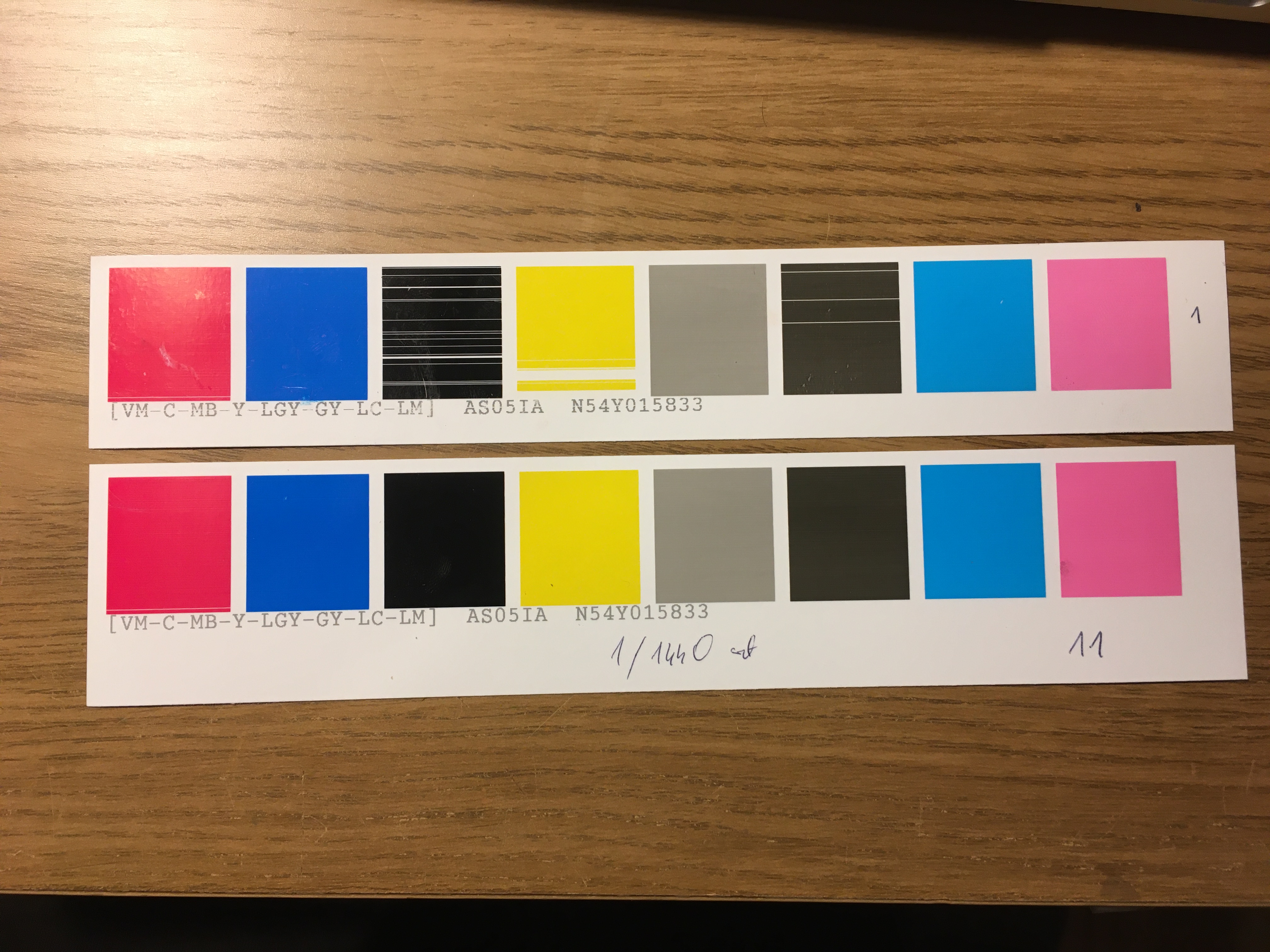 Witam po dłuższej przerwie :) Powiem szczerze nie myślałem , że zgłębię ten temat aż do tego stopnia ! Kosztowało sporo czasu i nie powiem, że po kosztach ...pewnie taniej wyszło by oddac na płukanie głowice ale jak się człowiek zajawi to brnie w temat aż w końcu zaśnie spokojnie :) na 1440 dysz 1 szt raczej nie do odratownia - reszta drożne (póki co nie zabieram się za to bo zalałem układ tuszem OEM i średnio się kalkuluje ponowne zalewanie układu płynem do udrażniania głowic, pewnie za jakiś czas ją rozbebeszę i strzykawka spróbuję jakimś mocniejszym płynem ). Plus zalania układu był taki że nie musiałem wymieniać całego "dampera". Fajnie wyczyścił złogi w całym układzie. Kwestia wypluwania czarnego tuszu w wybiórczych miejscach na wydrukach moim zdaniem była spowodowana nieszczelnym domknięcie zaworu "BK-PK". Najpewniej byłoby wymienić cały "damper" ale problem rozwiązał się po zalaniu i przepłukaniu układu :) Jak to w życiu bywa nie obeszło się bez strat ;) Jak już wcześniej wspomniałem przytkała się jedna dysza VM ale biorąc pod uwagę że łącznie jest ich 180 ... uznaję to za sukces :) Ps. po drodze zaznajomiłem się z z ripem "PrinFab" (polecam wersja trial miesiąc no i drukujesz wybranym tuszem - jak dla laika super no i można wykorzystać pozostałości wkładów do zalania układu nie inwestując w nowe) Na chwilę obecną pozostaje zaopatrzyć się w drugi zestaw wiecznych wkładów i szukać okazji na wkłady OEM U-Ch K3 80,110,220,700 ml ;) Na zakończenie wątku podsumowujące focio :) Pozdrawiam i miłego :)