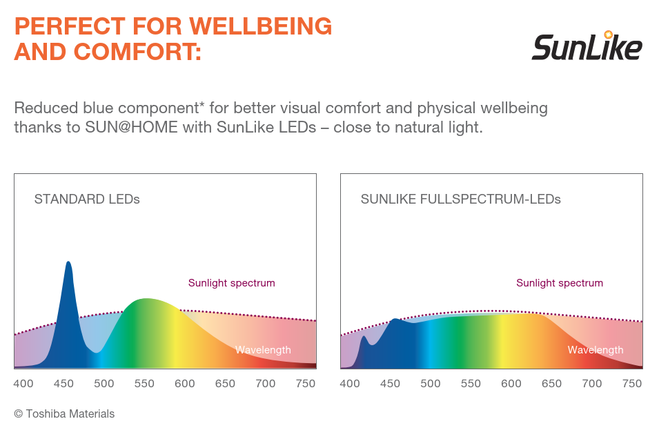 CRI to indeks bez większego znaczenia - Sun@Home (i inne źródła światła oparte o emitery SunLike/Toshiba TRI-R) mają widmo najbardziej zbliżone do światła dziennego i żarowego, dlatego wizualnie są bardziej neutralne i naturalne niż zwykłe LEDy.