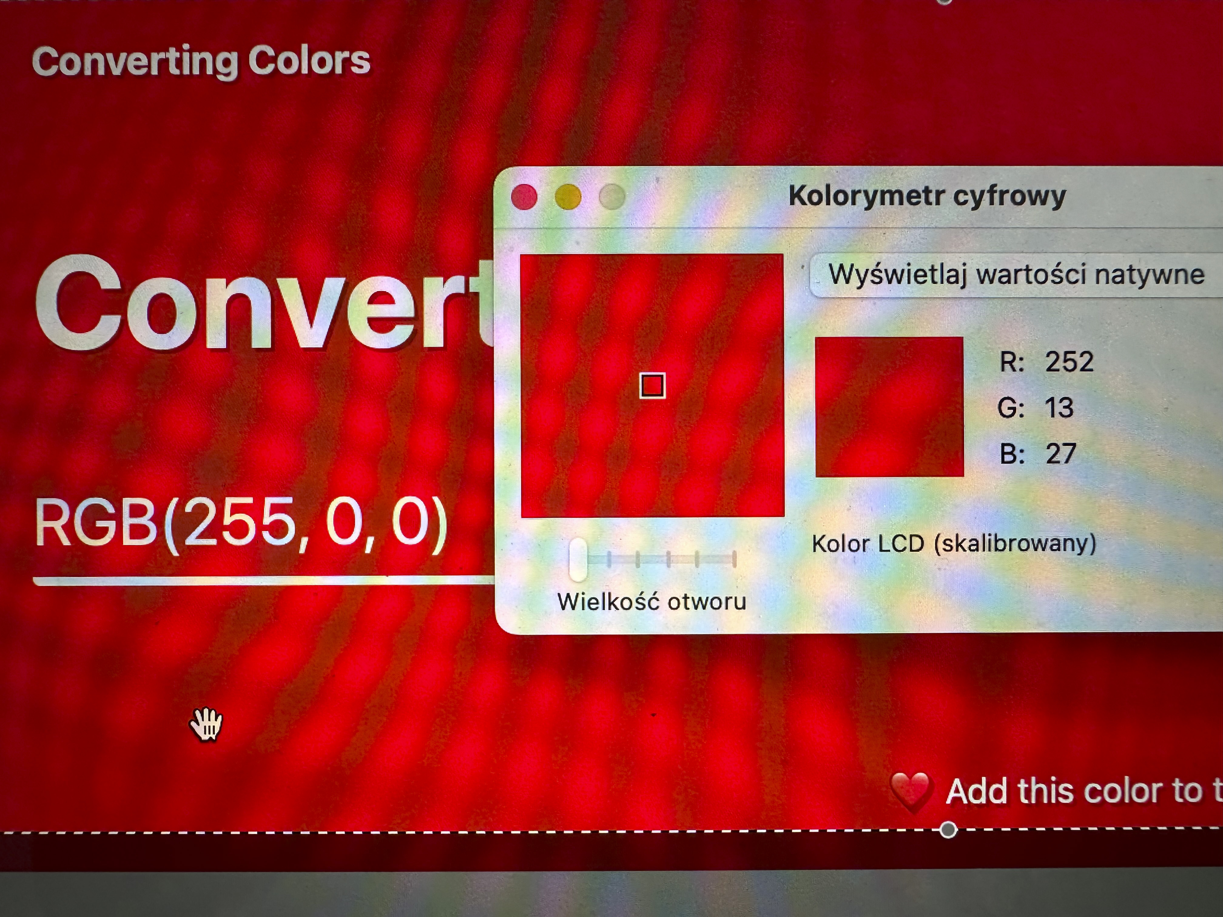 Do rzeczy, na pierwszym zrzucie ekranu dane z MacBooka, tylko i wyłącznie dla przykładu. Już tutaj można zauważyć, że na kolorymetrze cyfrowym nie ma czystej czerwieni - czy tak ma być, czy nie to już zostawiam do wypowiedzi Wam.