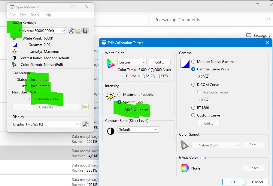 Wygląda to tak: można wejść w ustawienia jakiegoś profilu z kalibracji, zmienić ustawienia (np wartość nitów) i go zapisać; problem w tym że soft nie chce go wczytać/aktywować (screen drugi poniżej - uncalibrate i brak ptaszka przy liście profili).